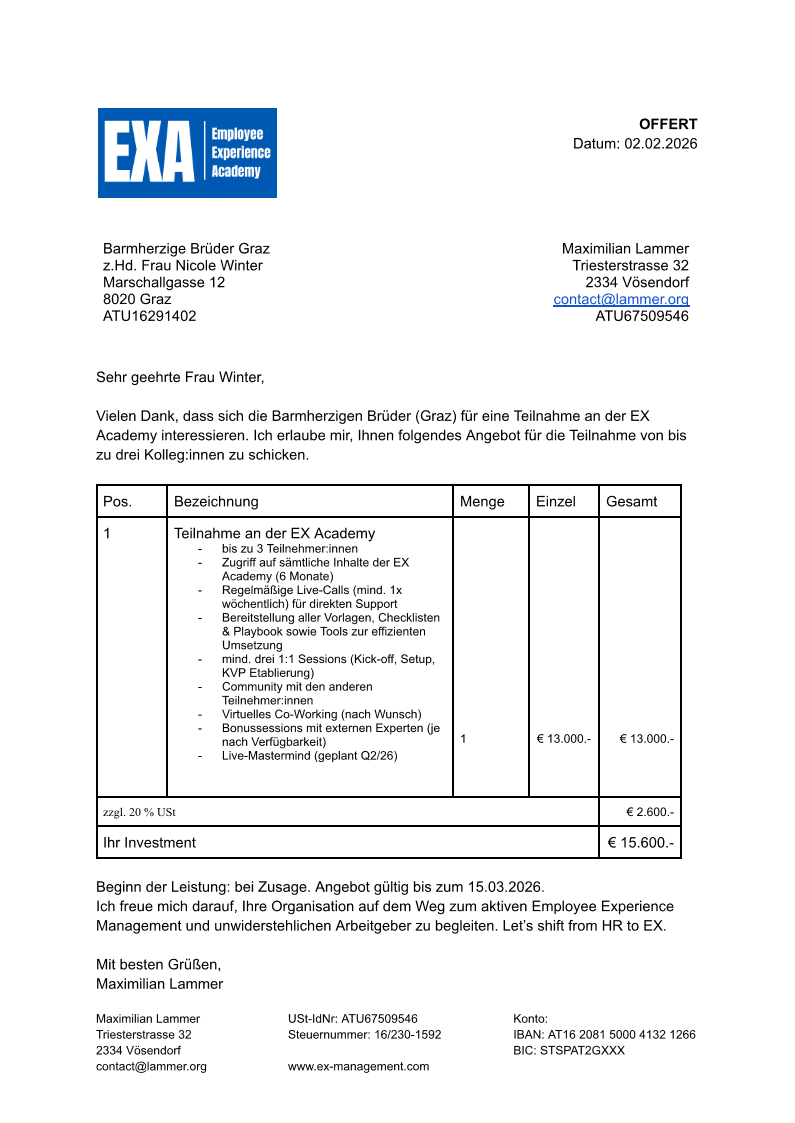 Bitte finden Sie hier mein Offert für die Begleitung Ihres Unternehmens im Rahmen meines Programms der "Employee Experience Academy".