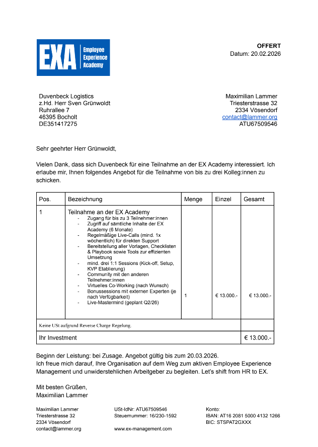 Bitte finden Sie hier mein Offert für die Begleitung Ihres Unternehmens im Rahmen meines Programms der "Employee Experience Academy".