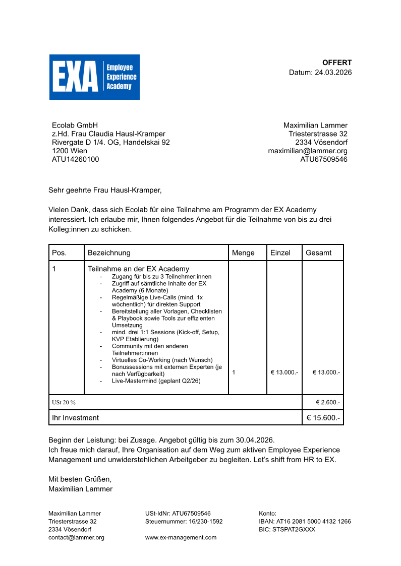 Bitte finden Sie hier mein Offert für die Begleitung Ihres Unternehmens im Rahmen meines Programms der "Employee Experience Academy".